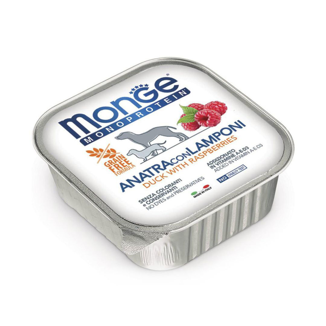 El paté monoproteico superpremium de pato con frambuesas de Monge será una auténtica delicia para los perros gracias a la carne fresca de la más alta calidad y a los ingredientes especialmente seleccionados por sus propiedades nutricionales. Este paté monoproteico de Monge está compuesto por una única fuente de proteína animal: pato selecto de la más alta calidad, con la adición de fruta, fuente natural de vitaminas y minerales. Un alimento equilibrado que contiene vitaminas A, E y D3, además de oligoelementos esenciales. Composición natural sin colorantes, conservantes ni azúcares añadidos.